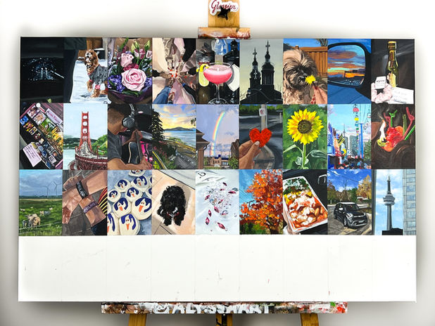 Throughout the past year, she meticulously documented fleeting moments and objects that ignited her creativity in daily life. "2023 Through Alyssa's Eyes" served as a true depiction of her year. Featuring both high and low moments, this piece was Alyssa's most vulnerable yet. These snapshots served as reference material for a unique creation on a 24” x 48” canvas, divided into 36 equally sized rectangles. Each rectangle was dedicated to a specific reference photo that she took herself. What added a thrilling dimension to this project was Alyssa's commitment to painting each rectangle, based on its corresponding reference photo, in a single sitting. The process was documented with videos shared the following day on her Instagram.